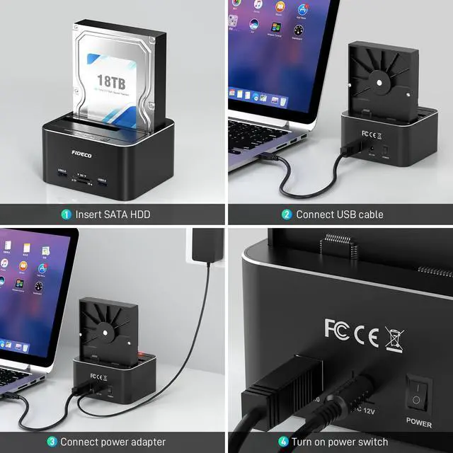 Useful Type-C PortFIDECO hard drive dock is engineered with type-C port, and we offer one USB C to USB C cable and one USB C to USB A cable, so you can use the 2 USB cables to utilize the full performance of your HDD. Access your files directly with desktops or laptops.