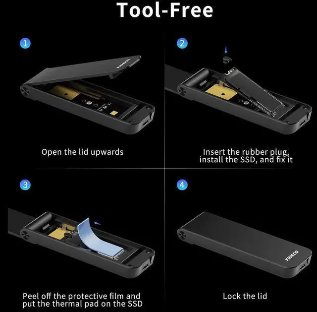FIDECO M.2 NVMe SSD Enclosure, M.2 NVMe to USB Adapter, USB 3.2 Gen 2 (10Gbps) SSD Reader for M & M+B Key, Sandwich Style Design, Tool-Free Installation, Support UASP and Trim