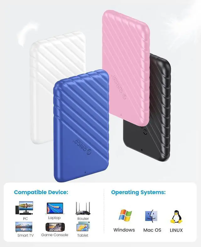Wide CompatibilityThis SATA to USB 3.1 drive enclosure is suitable for 2.5 inch SATA III/ II/ I Hard Disk Drives or solid state drives. This ORICO 2.5 inch computer hard drive enclosures can be quickly recognized by Windows 2000/Windows 98/XP/Vista/ 7/8/10, Lunix, Mac OS 9.1/10.8.4 and above. Widely applied on laptop, PC, Xbox, PS5/PS4/PS3, Router, etc.