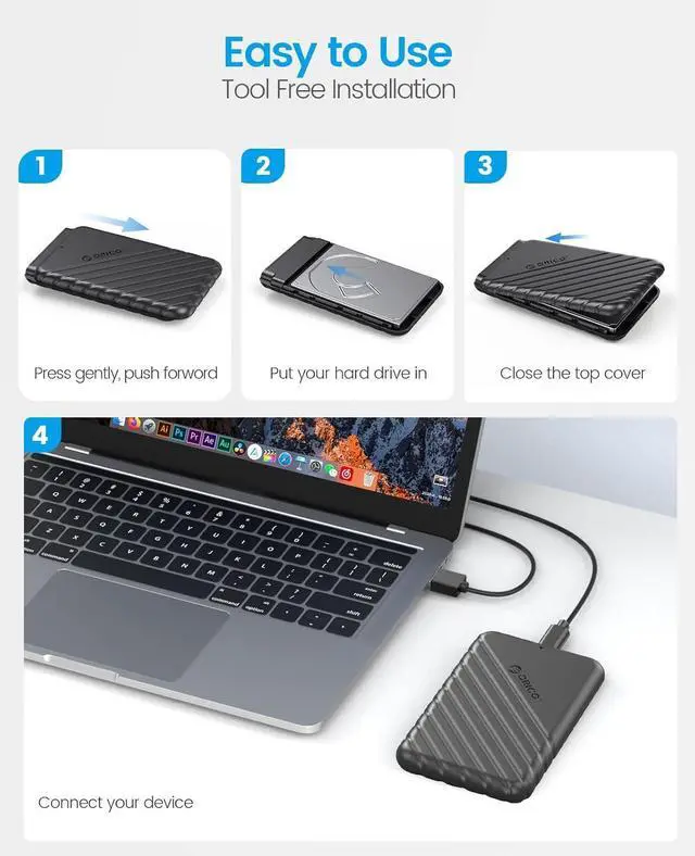 Ideal Hard Drive Enclosure ORICO external hard drive enclosure can easily connects 2.5 inch 7mm 9.5mm SATA I/II/III SSD & HDD to PC, laptop,TV, router, PS4, or Xbox, ideal for back up files, expanding storage or booting up old hdd/ssd and recovering important files of broken PC