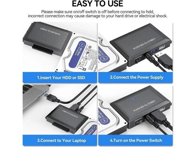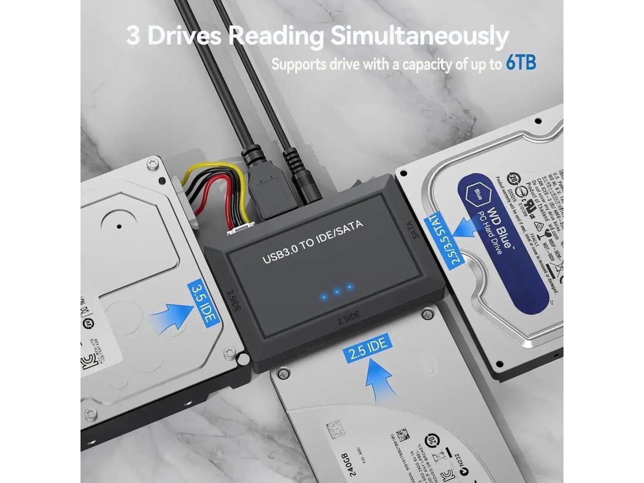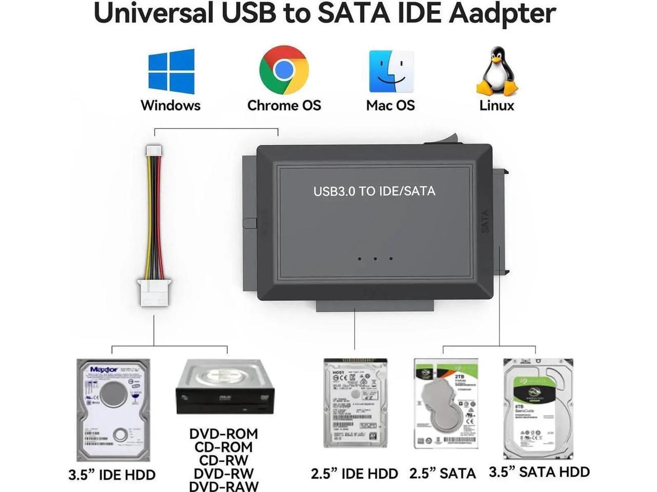 - [Universal IDE Hard Drive Reader] Connect SATA/IDE devices to your computer or laptop via a USB3.0 adapters. Compatible with 2.5"/3.5" HDD/SSD, 2.5"/3.5" IDE, 5.25" DVD-ROM, CD-ROM, CD-RW, DVD-RW, DVD+RW Optical Drive. It supports drvies with a capacity of maximum 6 TB.