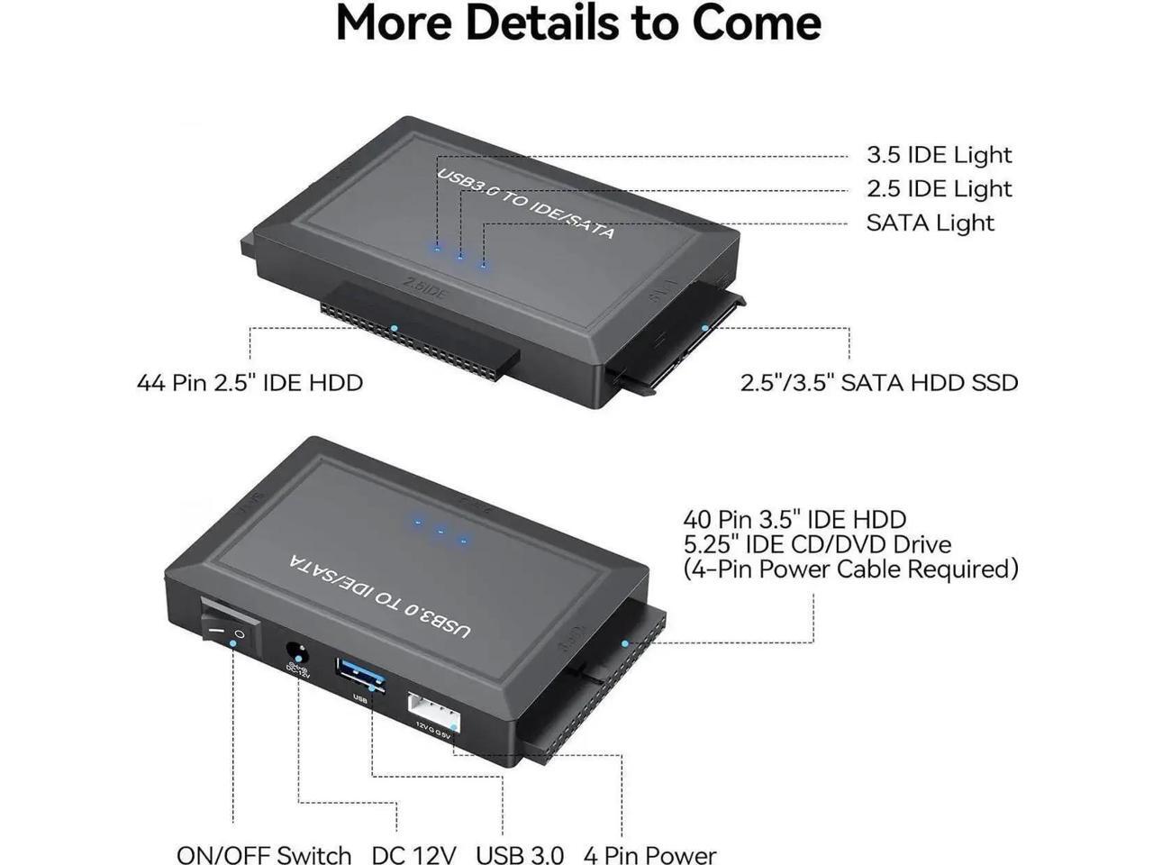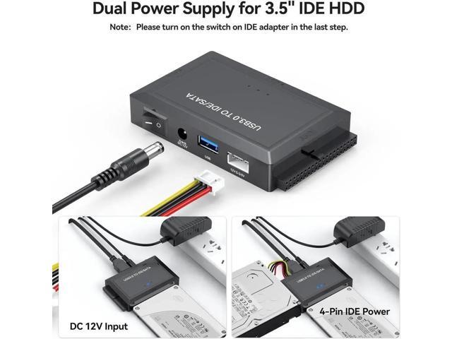 - [Three Hard Drives Simultaneously] This external hdd converter can support up to three hard drives simultaneously: one 2.5(44 pin) IDE, one 3.5(40 pin) IDE, one 2.5/3.5 SATA. For 3.5" IDE drivers and old SATA HDD, need to connect 12V/2A power adapter and 4-pin power cable provided.