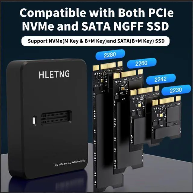 - This HLETNG NVMe External M.2 Enclosure SSD Adapter is compatible with M.2 PCIe/ NVMe and M.2 SATA SSDs Sizes for 2230 / 2242 / 2260 / 2280 (Not compatible with M.2 PCIe AHCI and mini SATA SSDs), Ideal for computer technicians/game users or personal users who have two different protocols of M.2 SATA or NVMe SSDs and need to switch between them frequently to upgrade and backup their SSD data; Plug & Play and tool-less design, even if you're a novice, you can be assured that you'll be able to choose this m.2 reader adapter