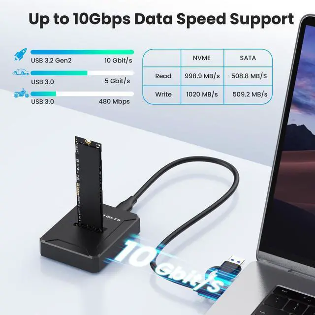 This M.2 NVMe SATA External Enclosure SSD Adapter is compatible with M.2 PCIe/ NVMe and M.2 SATA SSDs Sizes for 2230 / 2242 / 2260 / 2280 Ideal for computer technicians/game users or personal users who have two different protocols of M.2 SATA or NVMe SSDs and need to switch between them frequently to upgrade and backup their SSD data; Plug & Play and tool-less design, even if you're a novice, you can be assured that you'll be able to choose this nvme reader adapter