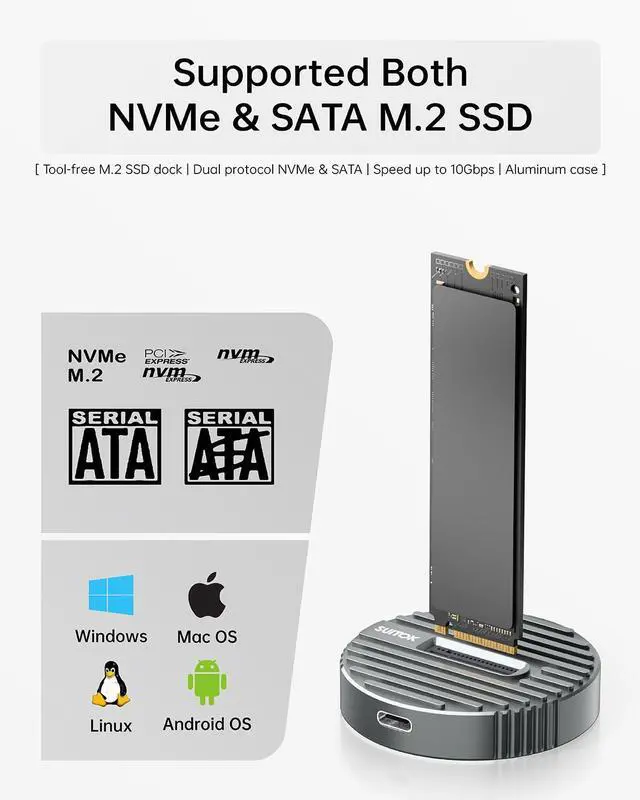 Compatible Model: both SATA / NGFF and NVMe / PCIE M.2 SSDs in sizes 2230/2242/2260/2280/22110.