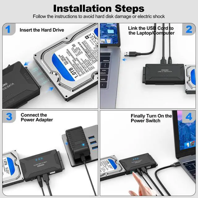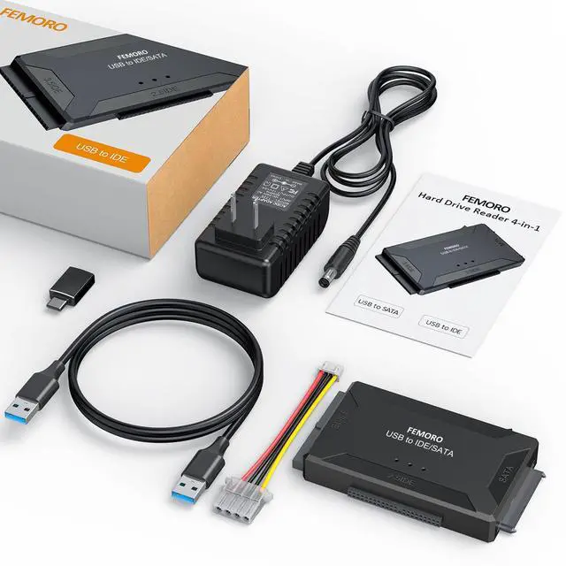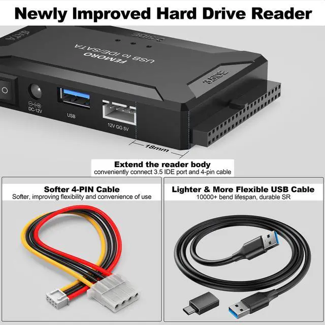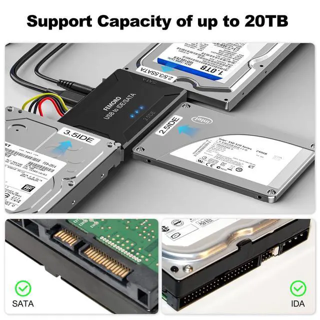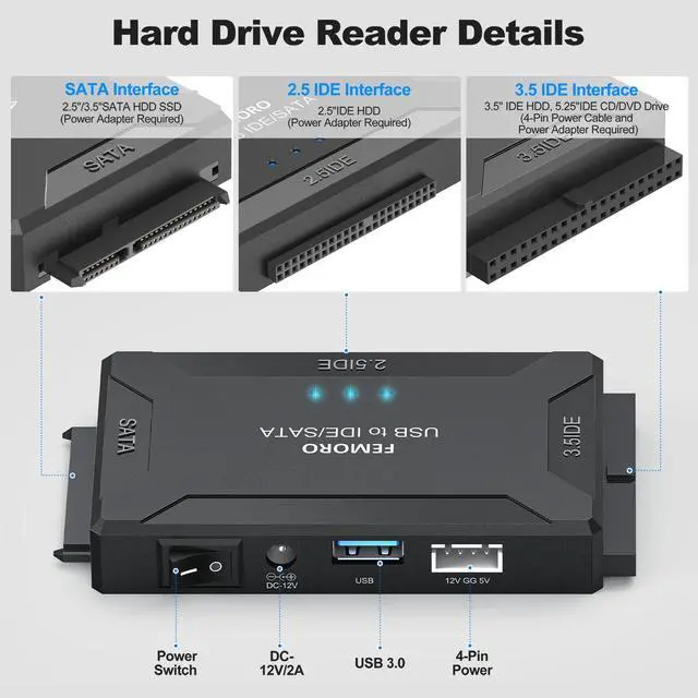 FEMORO sata and ide to usb/usb c adapter supports 2.5"/3.5" HDD/SSD, 2.5"/3.5" IDE, SATA Internal Blu-ray Drive; Hard drive converter is retrieve old files, backup, cloning and data recovery device tools. This converter allowing connect to three hard disk drives simultaneously.