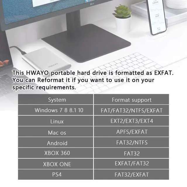 7. By default, This HWAYO portable hard drive is formatted as EXFAT. You can Reformat it if you want to use it on your specific requirements.