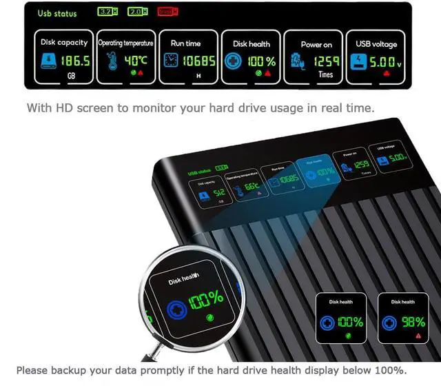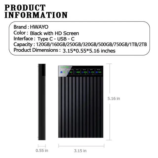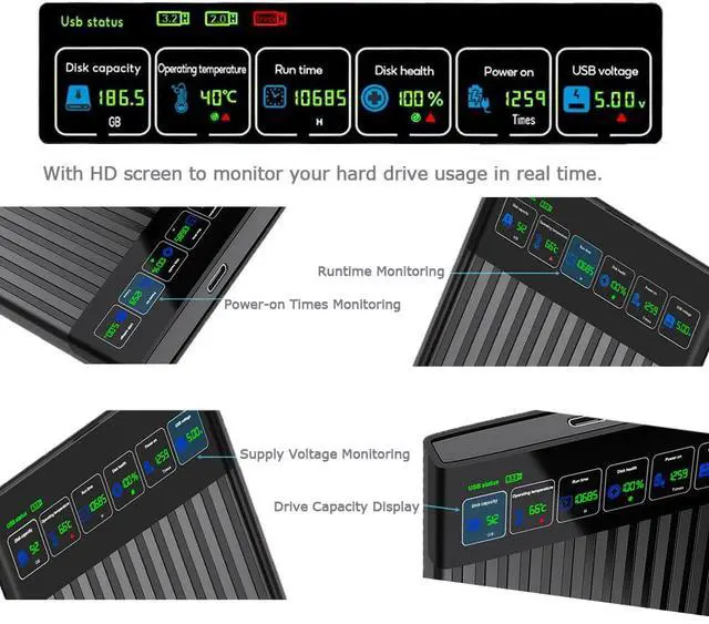 1. HD Screen Design - This external hard drive with HD screen display to monitor your hard drive usage in real time. Includes: Disk capacity, Run time, Power on, Disk health, Operating temperature, USB voltage.