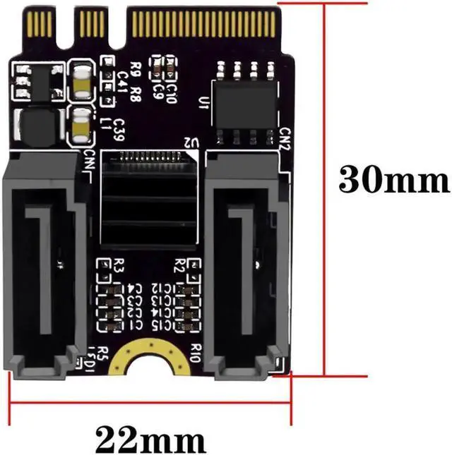 This adapter card can switch out 2 SATA interfaces through the M.2 (A+E Key) slot of the PC host, and the user can connect 2 SSD solid state drives or mechanical hard drives with SATA interfaces at the same time through the SATA data cable.