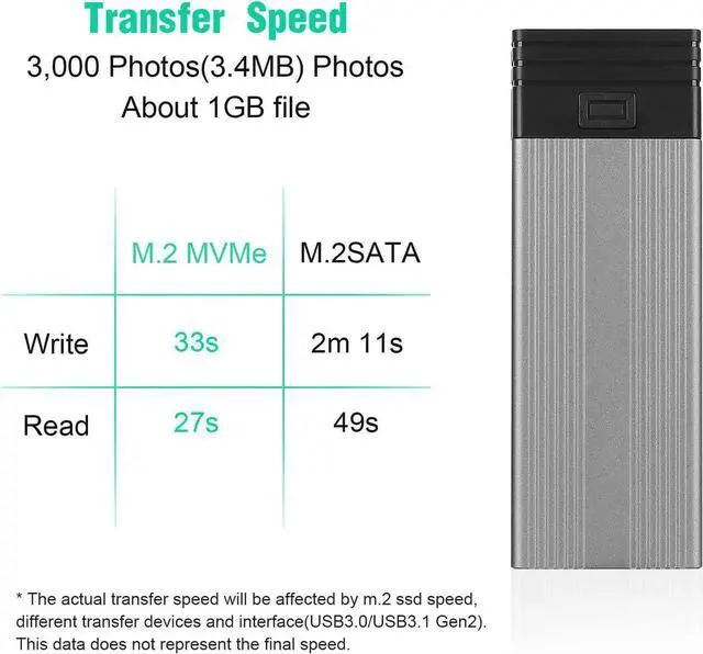 Chip RTL9210B & Tool-Free & Overheating Protection USB C 3.1 Gen 2 10Gbps to M. 2 NVME PCIe USB C 3.1 Gen 2 6Gbps to M. 2 SATA PCIe Backup and save files faster than ever before over USB, with read and write speeds of over 900 MBps/600MBps, when connected to a Thunderbolt 3 or USB 3.1 Gen 2 port. Tool-Free USB C to M. 2 NVMe SATA Enclosure's tool-free design allows the quick installation of an M. 2 NVMe or M. 2 SATA SSD in just a couple of seconds.