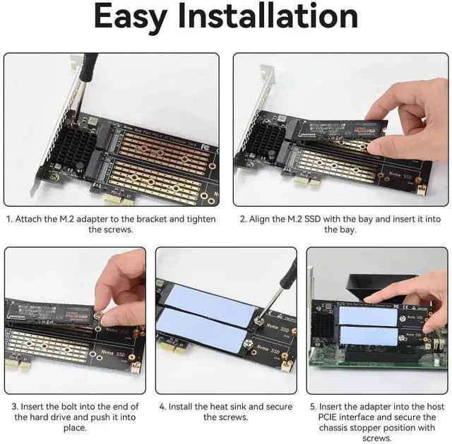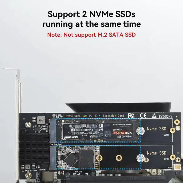 - [Product Information]Compatibility: Support PCIe X1/X4/X8/X16 slots. Suitable for M.2 NVMe M-Key and M+B Key SSDs. Data Transfer Speed: 5Gbps. Packing List: 1 x PCIe M.2 expansion card, 1 x long baffle, 1 x short baffle, 2 x screws, 2 x heat sinks and 1 x screwdriver.