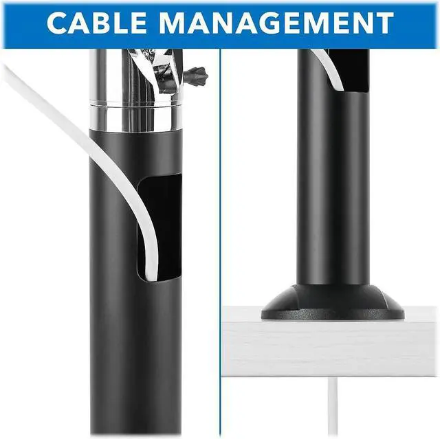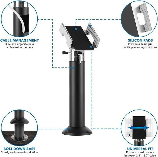 This is the perfect stand to securely mount your credit card machine to a countertop. It swivels 360° and tilts up or down for easy accessibility while using the card chip reader or PIN pad. Durable steel construction designed for daily use by cashiers and customers. The base bolts securely to a countertop, and the clamp enclosure adjusts to fit most card readers 2.4-3.7 inches wide. The hollow pole includes concealed cable management.