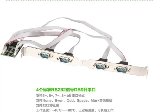 Mini PCIe to 4 RS232 Ports Expands one Mini PCI Express slot into 4 independent DB9 RS232 serial ports for industrial and embedded applications.