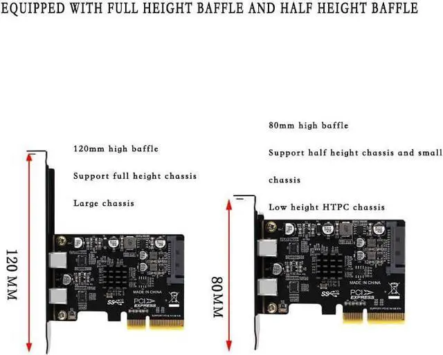 Equipped with full-height baffle + half-height baffle :120mm high baffle, support full-height chassis, large chassis .80mm high baffle, support half-height chassis. Small chassis, short chassis, HTPC chassis.