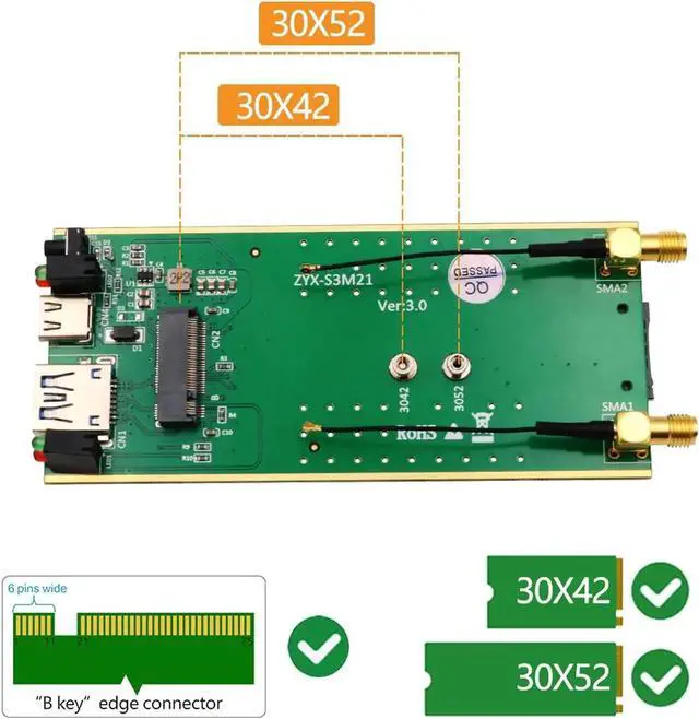 Support: M. 2 Key B to USB 3.0 adapter supports SIM, MicroSIM and NANO SIM card, and supports the size of M. 2 key B card of type 3042 or 3052.