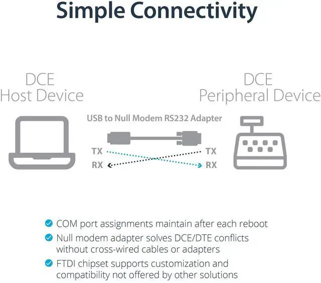 The USB to Null Modem adapter is compatible with a broad list of operating systems including Windows, Windows CE, Mac OS and Linux, making it easier to integrate into mixed environments.