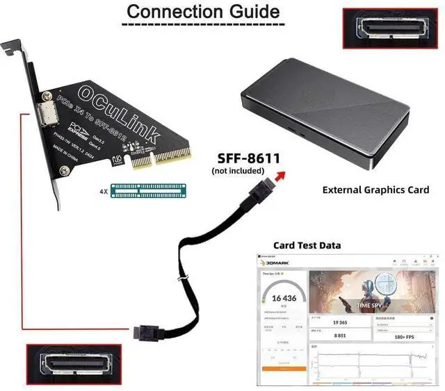 It can be connected e.g. one SSD or eGPU Graphics Card by using an optional cable. Suitable for small hosts, desktops, laptops, etc. to convert PCIE sockets to Oculink sockets, with fixing holes for fixing.
