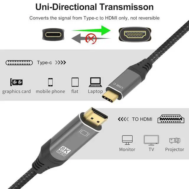 HDMI Cable: USB C to HDMI 2.1 Cable allows you connect your USB Type-C (Thunderbolt 3/4 compatible) laptops/smartphone/tablet and more to a HDMI monitor/projector, provide you with a super high-definition video experience. Supports 8K high-definition resolution for realistic 3D visual effects, allowing you enjoy the immersive entertainment and gaming experience on a bigger screen. (*Note: this cable is unidirectional and charging is not supported. )