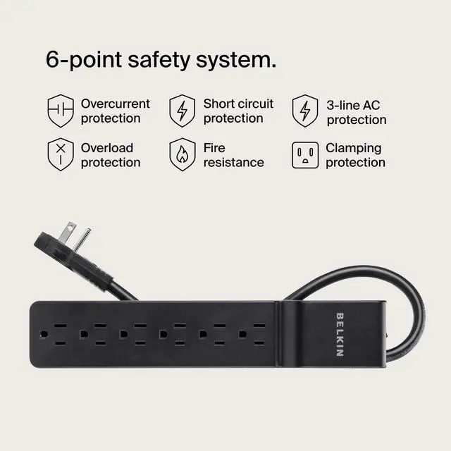 6-POINT SAFETY SYSTEM ENSURES SAFE CHARGING & POWERING FOR DEVICES: This power strip surge protector has Fire resistant material, Overcurrent protection, Overload protection, Short circuit protection, Clamping protection, and 3-line AC protection.