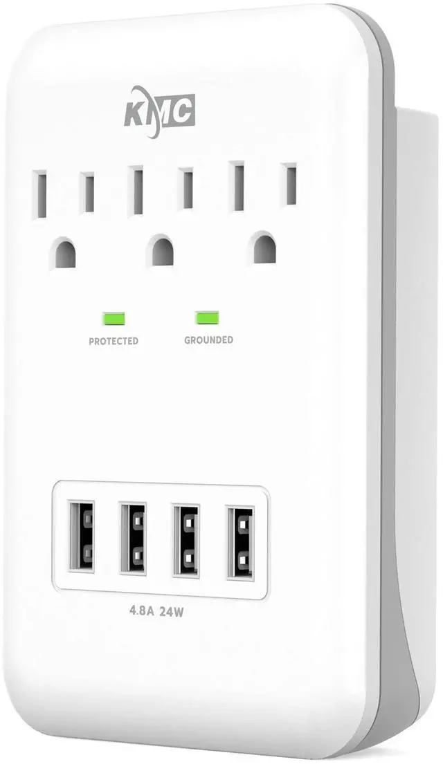 3-Outlet Wall Mount Surge Protector, 900 Joules, 4 USB 4.8 AMP USB Charging Ports, Phone Holder Cradle for Home, School or Office, ETL Certified