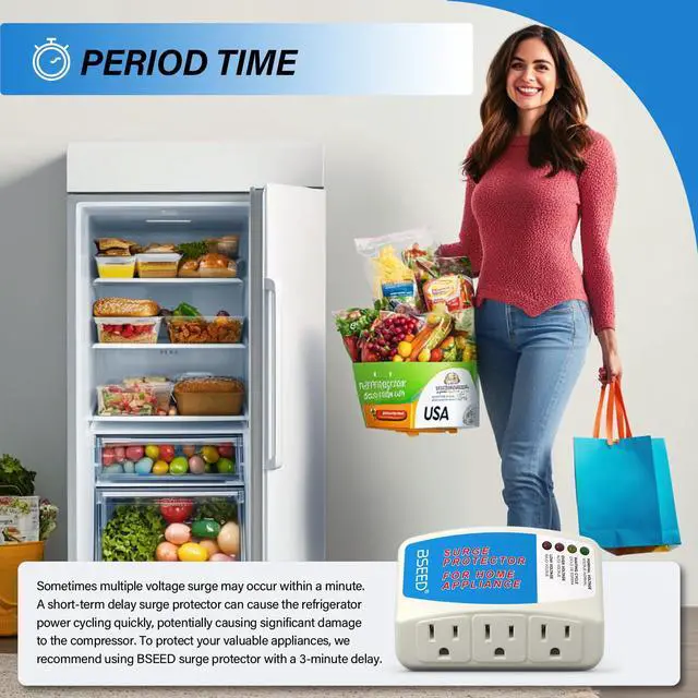 3 Minutes Period Time: Sometimes multiple voltage surges may occur within one minute. A short-term delay surge protector can cause the refrigerator power cycling quickly, potentially causing significant damage to the compressor. To protect your valuable home appliances, we recommend using this surge protector with a 3-minute delay.
