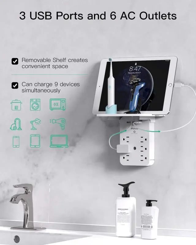 Space Saving & Removable ShelfWall outlet shelf keeps your devices off the counter, making charging easy. It can also hold a variety of common household items such as razors, toothbrushes, and speakers.
