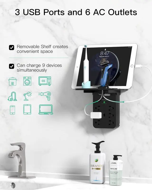 Space Saving & Removable ShelfThe wall outlet shelf elevates your devices off the counter for easy charging. It can hold a variety of common household items, including razors, toothbrushes, speakers, and more.