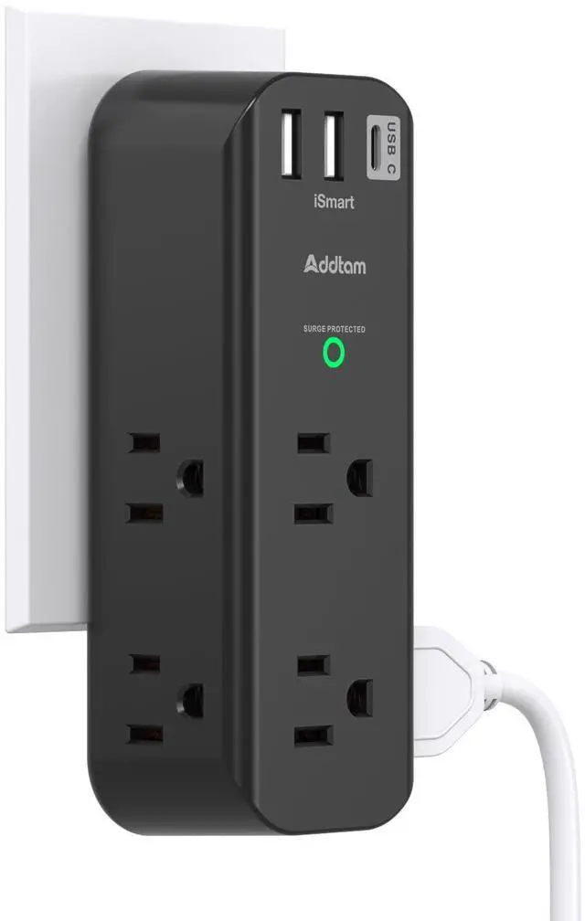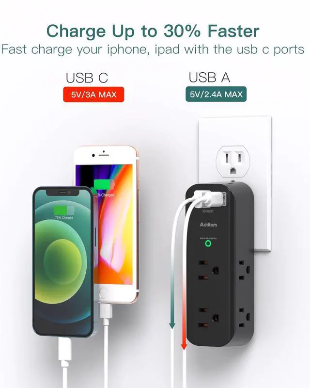 Wall Outlet with USB Ports- The USB wall charger surge protector includes 3 USB charging ports (total output DC 5V/3A), with a USB C charging port featuring smart technology that detects and charges your devices quickly, up to max 5V/3A. The USB A charging port supports up to 2.4A Max and is compatible with almost all USB devices (the actual current is determined by the devices' requirements).