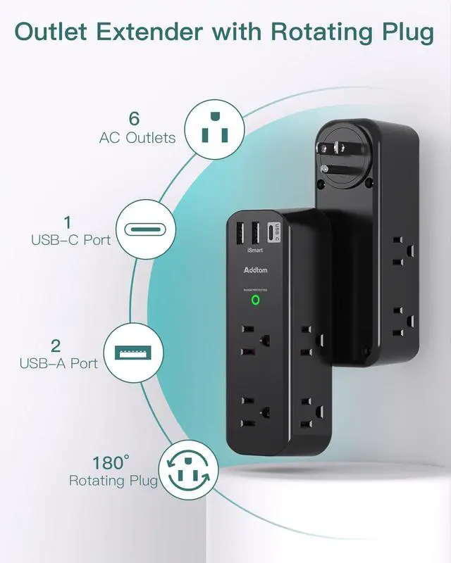 Multi Function USB Wall Outlet- The electrical outlet extender comes with 6 AC outlets and 3 USB charging ports (1 USB C), allowing you to power up to 9 devices simultaneously. The outlet splitters 3-sided slim design offers more power options while occupying minimal space.