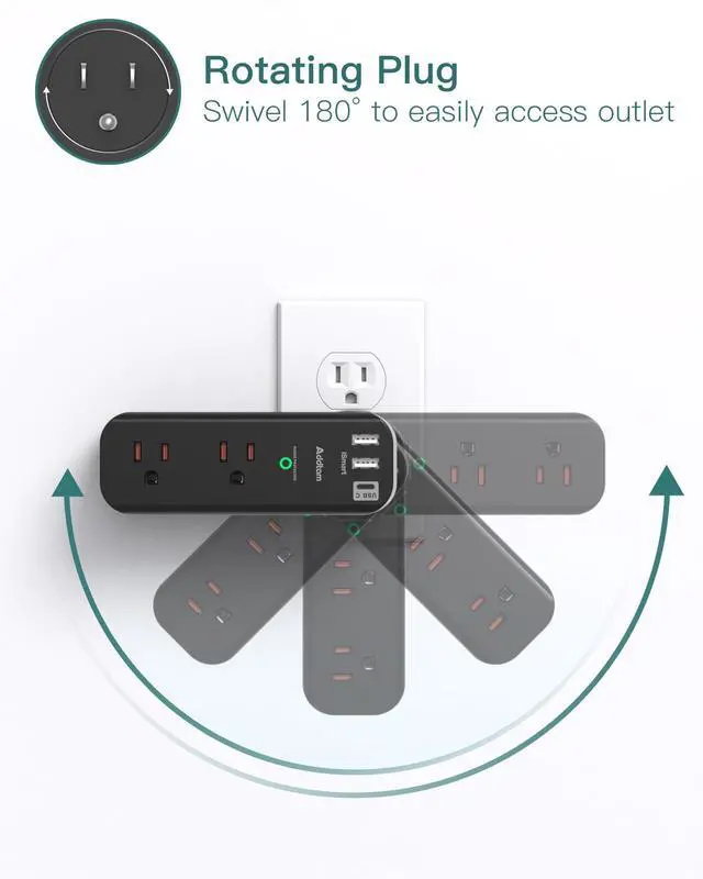 Multi Plug Outlet with Rotating Plug- The outlet extender with USB ports can be tilted left and right 90 degrees conveniently, allowing for manual adjustment to the desired angle. There is ample space (1.5 inches) between adapter outlets on the sides, accommodating larger chargers easily. This compact surge protector is also portable for travel.