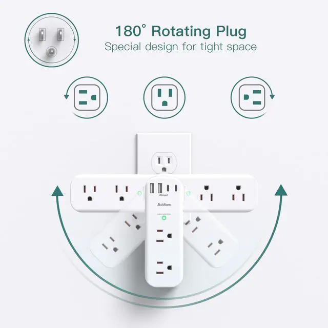 Multi Plug Outlet with Rotating Plug - The outlet extender with USB ports can rotate 90 degrees left and right for convenient adjustment to the right angle. The 3 sides have 1.5 inches of space between adapter outlets, easily accommodating larger chargers. This compact surge protector is perfect for travel.