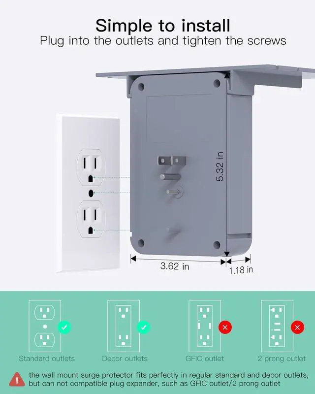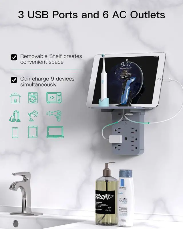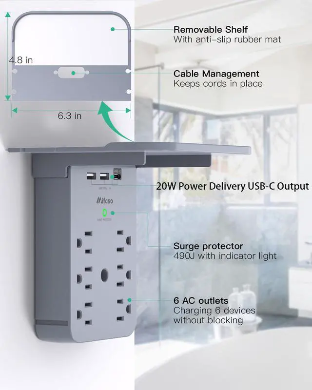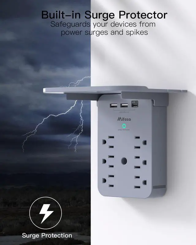 Wall Outlet Extender - Surge Protector 6 AC Outlets Multi Plug Outlet with Shelf, 2 USB and USB C Charging Ports Wall Plug Expander, USB Wall Charger Outlet Splitter for Home