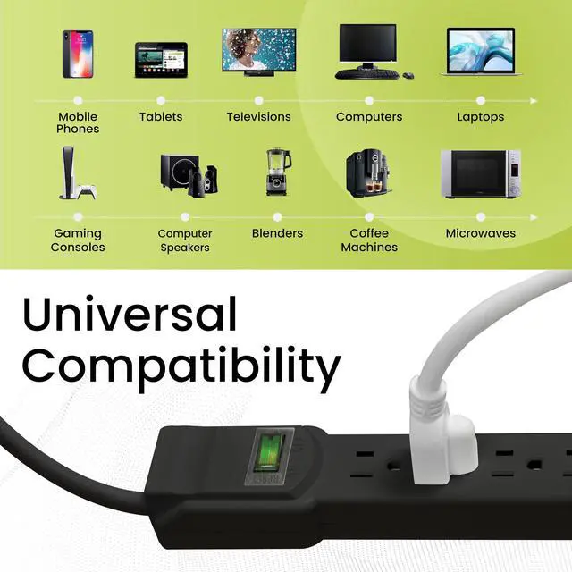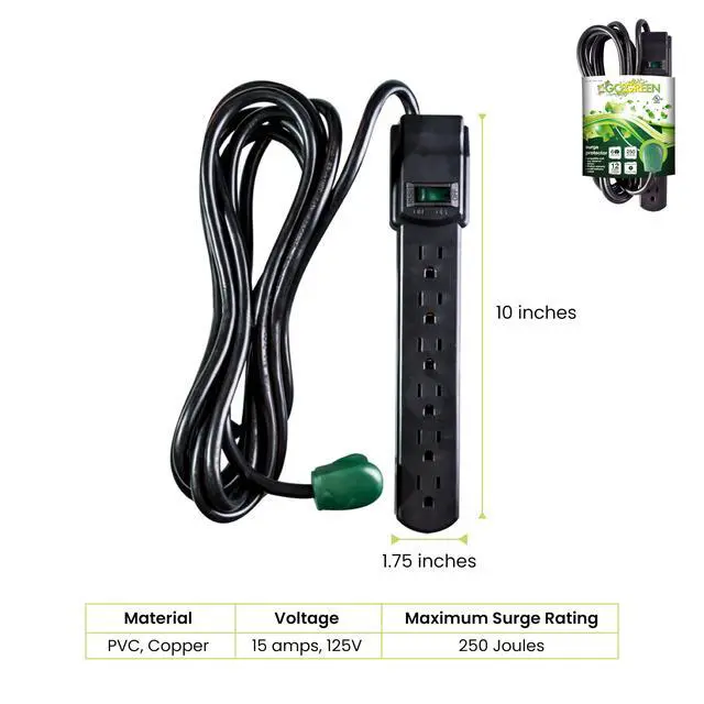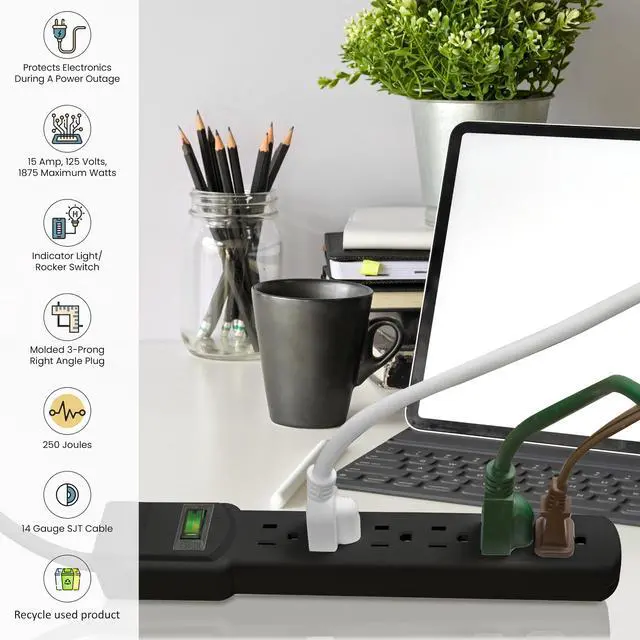 6 Outlet Surge Protector: Provides 250 joules of simultaneous protection against electrical power surges for its 6 adaptors, all at once, making it ideal for almost any indoor electrical appliances.