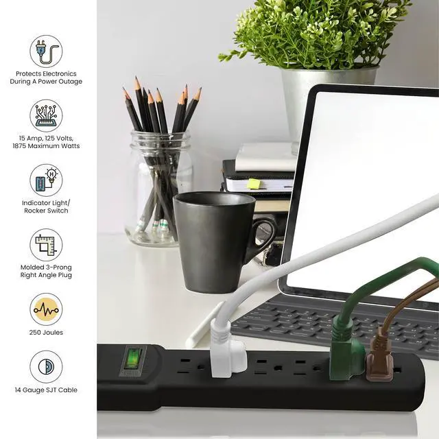 6 Outlet Surge Protector: Provides 250 joules of simultaneous protection against electrical power surges for its 6 adaptors, all at once, making it ideal for almost any indoor electrical appliances.