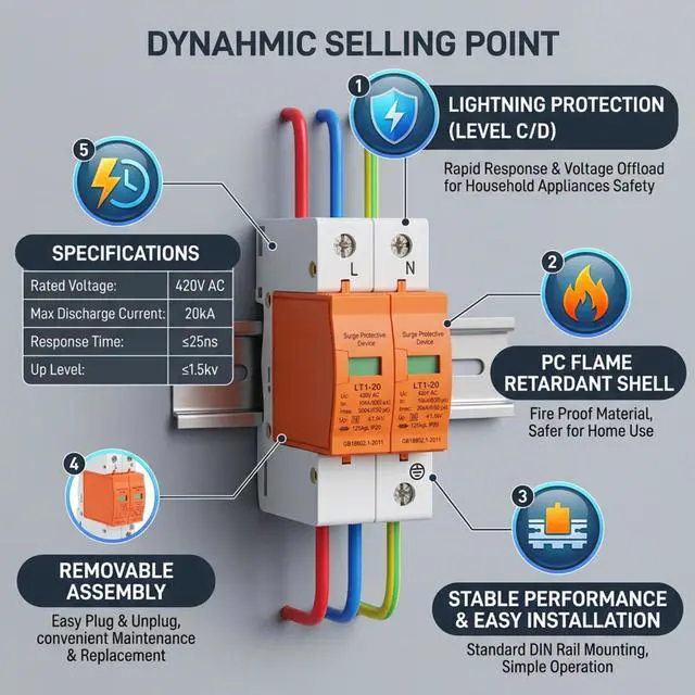 Advanced Protection: This 2P house protective device is designed to offer robust C and D level protection. It effectively serves as an equipotential connection during strikes, quickly responding to voltage surges and safeguarding both your household appliances and your safety from electrical hazards.