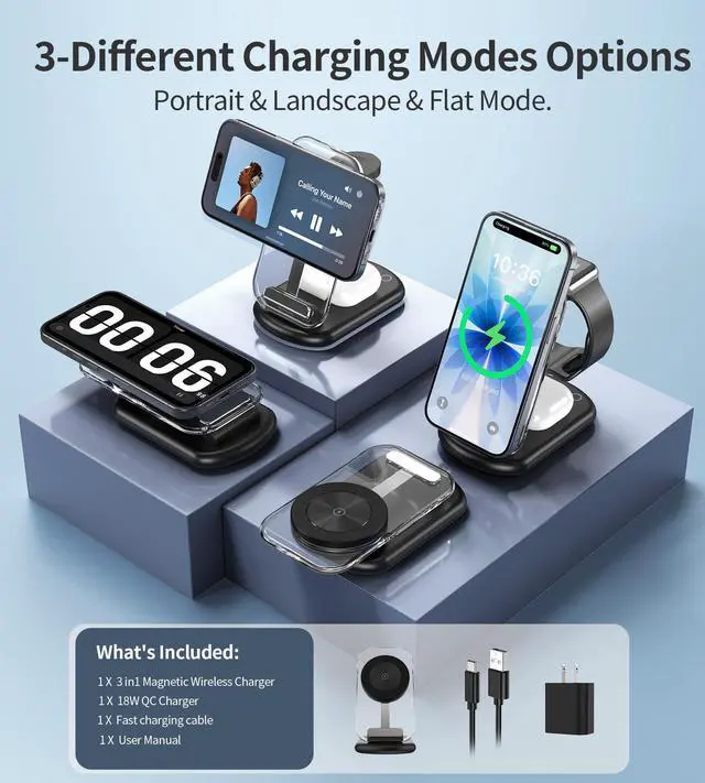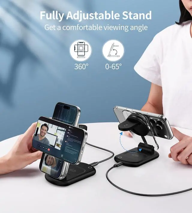 3 in 1 Foldable Wireless Charger iphone docking station charger. The charging station for multiple devices, support charging iPhone, iwatch, AirPods simultaneously. It suitable for all Apple iPhoneiPhone 16, 16 Plus, 16 Pro, 16 Pro Max, iPhone 15, iPhone 15 Plus, iPhone 15 Pro, iPhone 15 Pro Max, iPhone 14, iPhone 14 Plus, iPhone 14 Pro, iPhone 14 Pro Max, iPhone 13 mini, iPhone 13, iPhone 13 Pro, iPhone 13 Pro Max, iPhone 12 mini, iPhone 12, iPhone 12 Pro, iPhone 12 Pro Max, For Apple Watch For iWatch 10/9/8/7/6/5/4/3/2/SE/Ultra/Ultra 2 (Note: Only for Apple Watch, not for Samsung or other Watch); For AirPods For AirPods 2/3/4/Pro/Pro 2 (Note: for AirPods, only work with wireless charging case, doesn't support with A3058, A2897, A1602 charging case)
