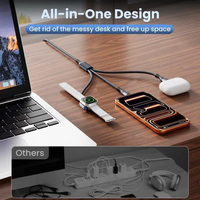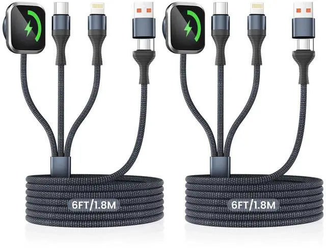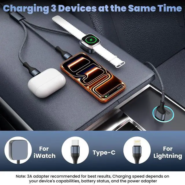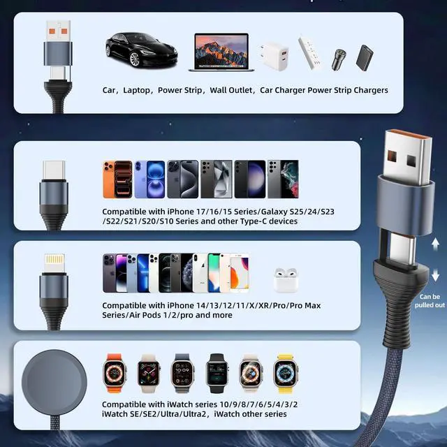 [3-in-2 Charger for Multiple Devices]: This multi charging cable combines a USB-A/C input with Watch Charger/USB-C/IP outputs. It offers 6 charging modes, ready to power up your Watch, iPhone, and other USB-C devices anytime. The 3-in-2 charging cords is a must-have for vacations essentials, car accessories, camping essentials and cruise essentials. It's also an ideal choice for planes, cruise ships, road trips, the office, and home use