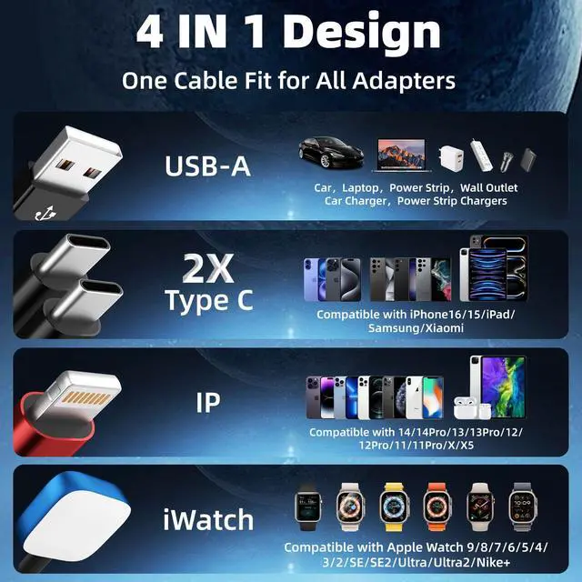 Dual Type-C 4-in-1 Multi Charging CableSpotting two Type-C Port, a IP port, a micro usb cord, and one iWatch charger cable, this multiple iphone watch charger covers all your charging options. Dual type-C ports design makes the multi chargers for all devices can charge all new-model phone devices. Both USB A or USB C charger can be used, one cable is enough and say goodbye to cable clutter, saving you from carrying multiple chargers.