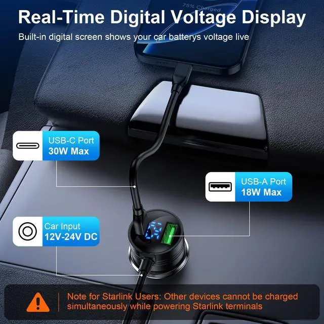 This starlink mini car charger power cord comes with an LED voltage display, when plugged into the cigarette lighter jack, it will always monitor the status of the powered battery when powered. Full protection your device can be safely powered.