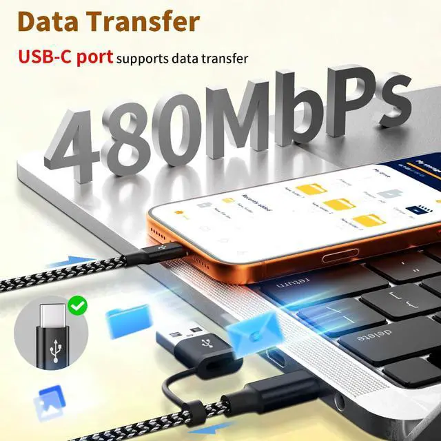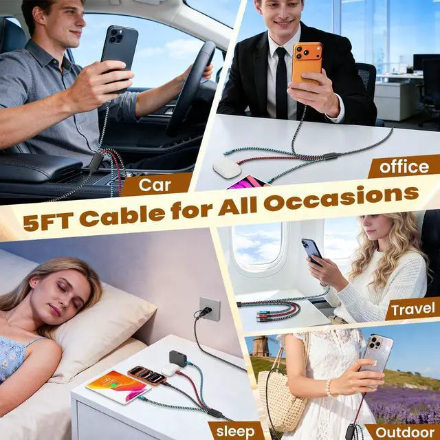 Perfect Travel Companion, 5ft Length:This 5ft long 4-in-2 charging cables for multiple devices is the ideal choice for business trips, travel, and in-car charging. The moderate length ensures that the multi charger doesnt get too tangled during charging, allowing you to charge your devices anytime, anywhere. Its compact enough to fit into your travel bag, backpack, or car storage box without taking up space while providing efficient charging support. Its the best choice for gifting to family, friends, or travel companions