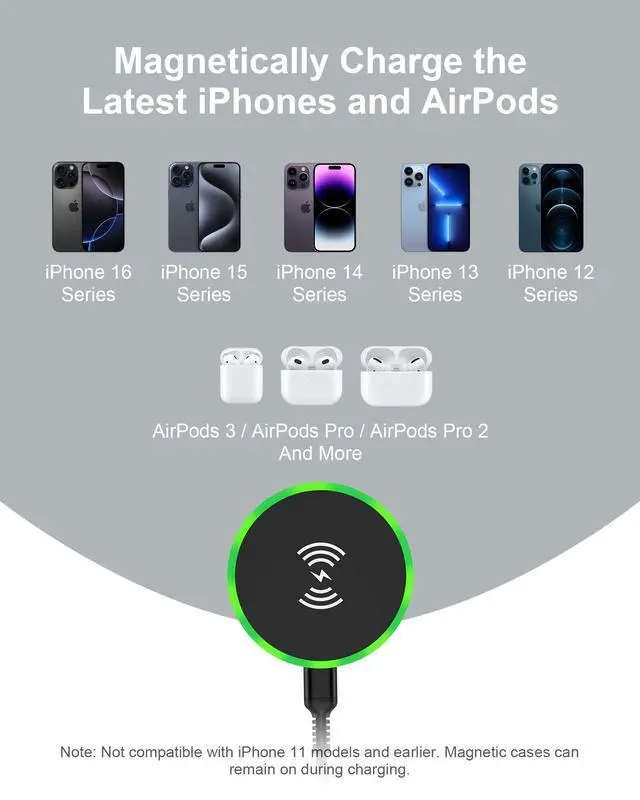 Note: iPhone 12-16 series can automatically charge magnetically without a phone case. iPhone 8-11 series and other Android phones(samsung, Google) need With Mag-Safe case also supports magnetic charging
