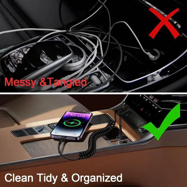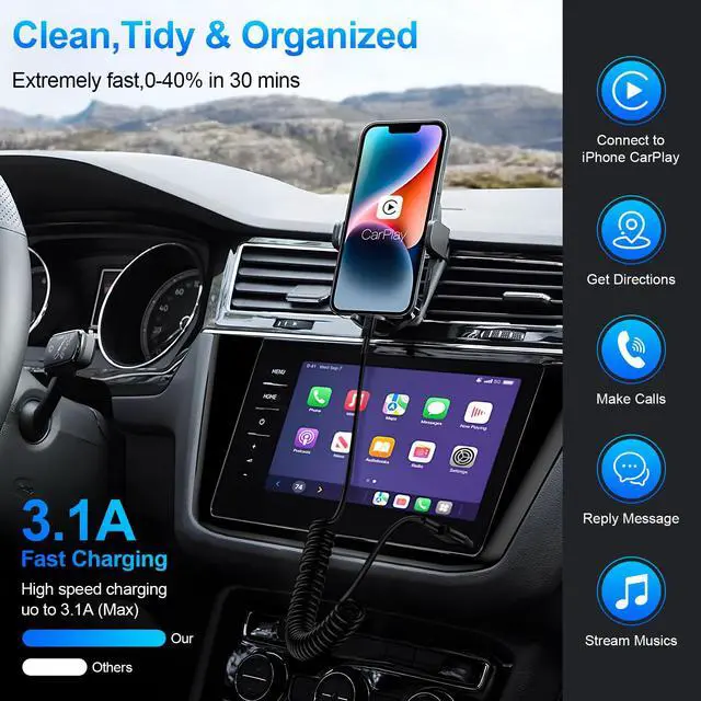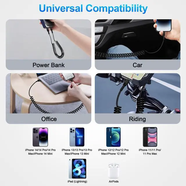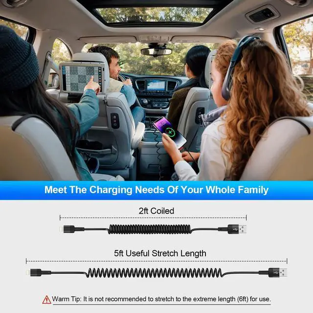 • Coiled Lightning CarPlay CordRetractable iphone 14 charger cord contains an upgraded DAC chipset for 3.1A fast charging and 480Mb/s high-speed data transmission. iphone 14 pro max charging cable fulfills rigorous standards to assure full compatibility with your iphone 13 pro/14 pro. iphone fast charger allow you to connect iphone 14 plus to car using apply carplay quickly and stable. coiled retractable design keeps you from having loose usb iphone 12 charger cable all over the console of your car. Nice and Neat.