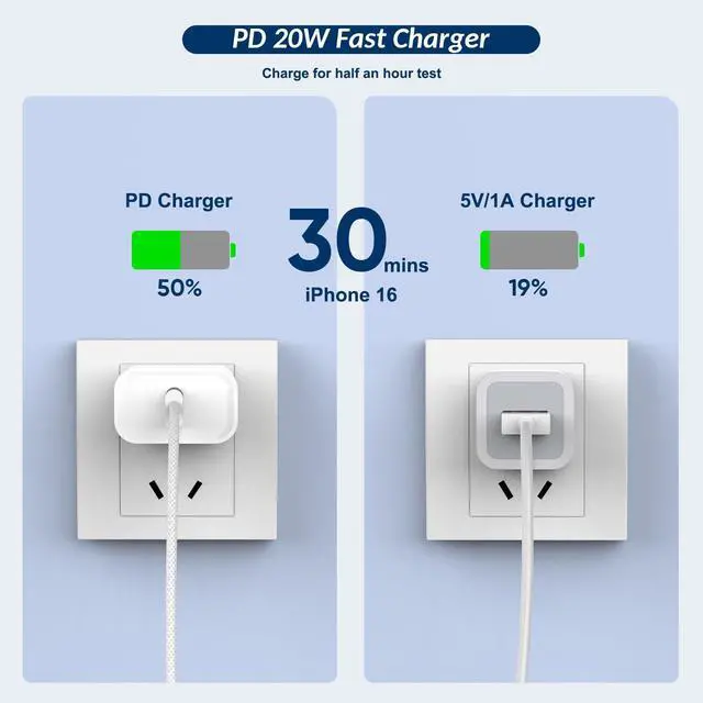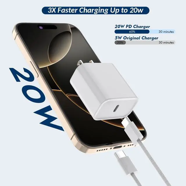20 watt fast charger charges devices up to 50 percent in Half an Hour, and the Product Lightweight, Precise Data Design is Easy to Plug in and Won't Come Loose