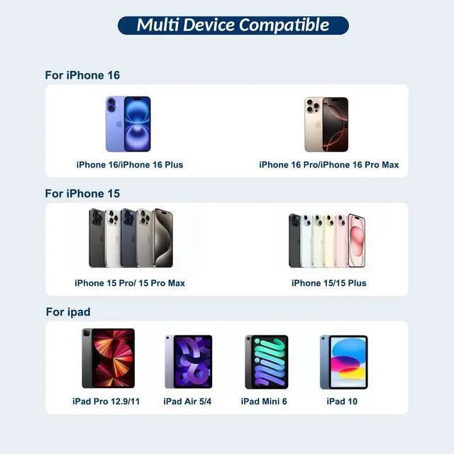 | Compatible Phone Models | Compatibility with 10ft/60W USB C iPhone 16 Charger Cable for iPhone 16/16 Plus/16 Pro/16 Pro Max/iPhone 15/15 Plus/15/15 Pro/15 Pro Max, iPad Mini 6, iPad Pro 12.9-inch 5/4/3rd Edition, iPad Pro 11-inch 3/4/2nd/1st Edition, iPad Air 4, for Fast Charging. |
