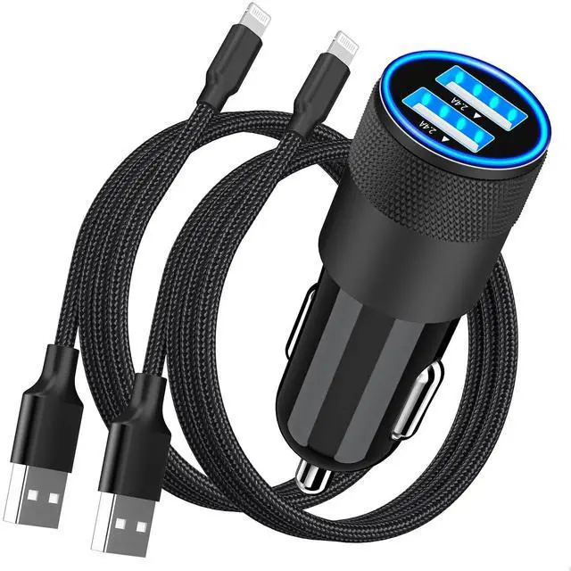 MFi CertifiediPhone Car Charger Fast Charging, Rombica 4.8A Dual USB Smart Power Cigarette Lighter USB Car Charger with 2Pack Lightning Braided Cable for iPhone 14 13 12 11 Pro XS Mini XR X SE iPad