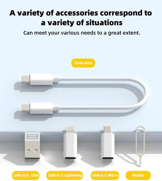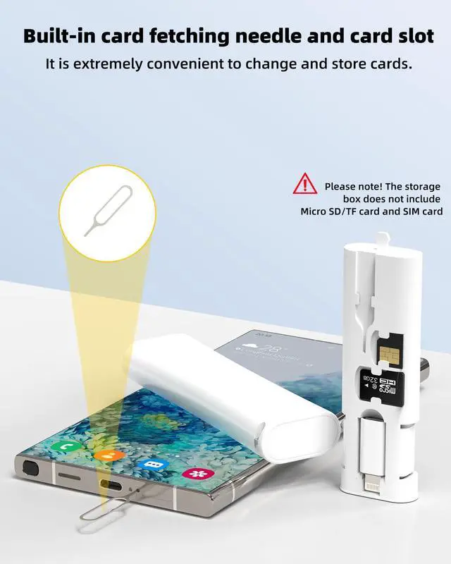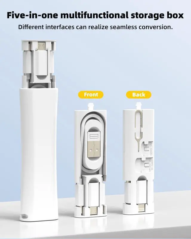 This 5-in-1 multifunctional cable storage box combines a dual-head USB C 60W fast charging cable, 3 plug converters (USB C to Lightning 27W, USB C to USB, USB C to Micro USB), a SIM eject pin, and 2 slots for SIM and Micro SD (TF) storage (cards not included). The push-to-open ABS case keeps everything organized, compact, and durable. It supports fast charging, smooth data transfer, and multiple interfaces for daily or travel use. compatible with iPhone 17/16/15/14/13/12 Pro Max, for iPad, compatible for Samsung Galaxy S25/S24/S23/S22/S21/S20 Ultra, Android devices, PCs, and laptops, as well as other USB C/Lightning/USB/Micro USB devices. Please note! The storage box does not include Micro SD/TF cards and SIM cards. We also provide a 60-day money-back guarantee, 1-year warranty, and 24-hour customer support for the product you receive.