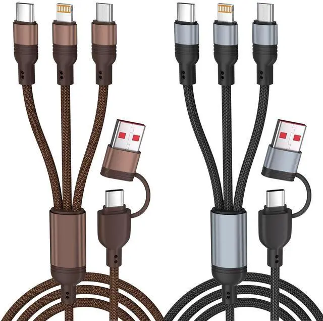 Travel Multi Charging Cable, 5 in 1 Charging Cables for Multiple Devices, Nylon Universal Phone Charger Cord USB A/C to Type C/Micro USB/IP for iPhone17/16/15/14/Phone&Pad (2Pack, 4FT)Brown+Black
