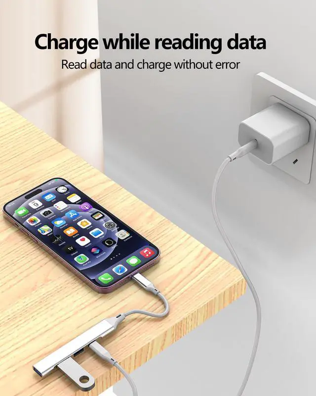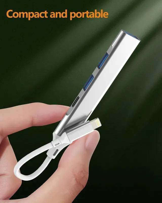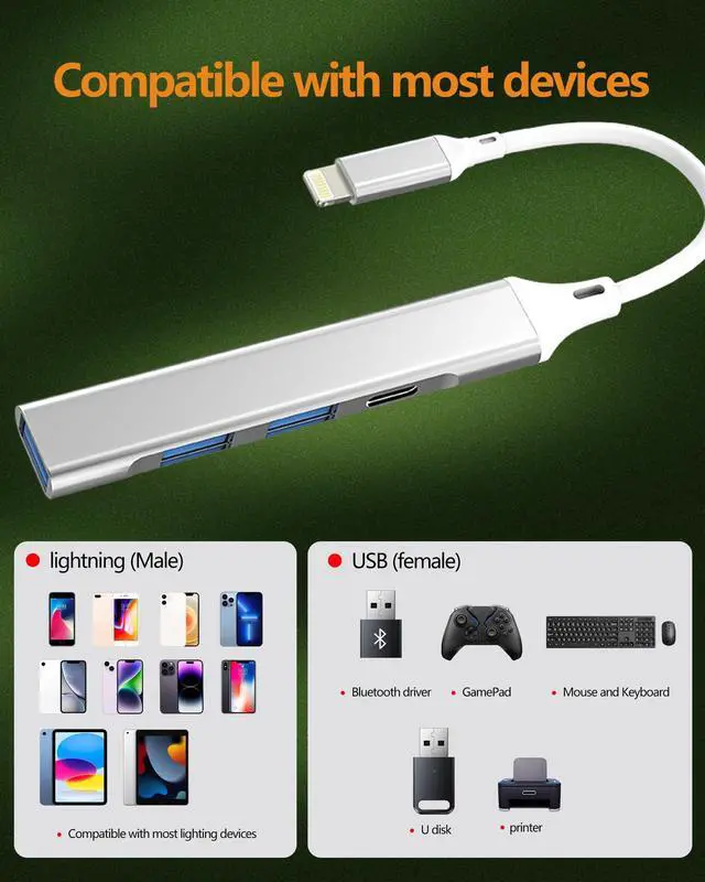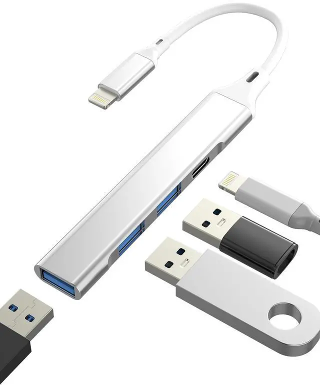 Maximize your device's capabilities with this 4-in-1 Lightning Adapter. Featuring three USB ports and a dedicated Lightning charging port, this adapter is perfect for expanding your device's connectivity without the hassle of constant device switching. Ideal for iPhone, for iPad, and other Lightning-enabled devices, it supports high-speed data transfer (up to 14-20MB/s), making it quick and easy to move and share your files.The built-in aluminum casing provides excellent durability, enhanced heat dissipation, and a sleek design thats easy to carry wherever you go. Whether for work, travel, or leisure, this adapter ensures your devices stay powered and connected without interruption. Plus, its plug-and-play, with no need for any extra software.Enjoy seamless access to your photos, videos, documents, and other files, and effortlessly transfer them between your USB devices and Lightning devices. The 4-in-1 adapter is fully compatible with for iPhone 14/13/12/11, for iPad, and more, offering a simple solution for users who need more ports in a compact, efficient device.