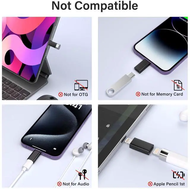 | Attention Please | It does not support OTG functions of video and audio, headset. (Not Designed for headphones & Not for Apple wired Earbuds!!) , And Not for iPad Pencil (1st generation), mouse, keyboard, flash drive,sd card reader, square reader, printer, microphone, camera, Hubs, HDMI converter,etc. |