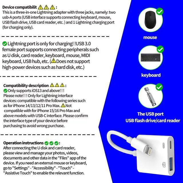 Apple CertifiedLightning Male to USB Female Adapter OTG and Charger Cable for Iphone 11 12 mini max pro xs xr x se 7 8plus Ipad air A Camera Memory Stick Flash Drive Cord Converter Charging Splitter
